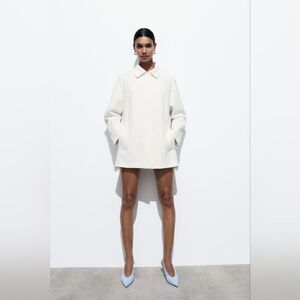Coat with lapel collar and long sleeves. Raised detail. Front welt pockets. Front button closure.
