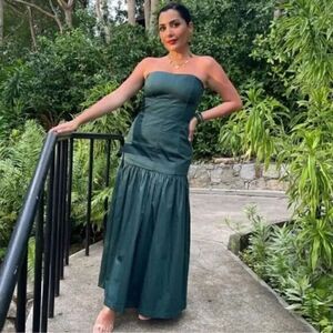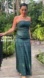 Strapless midi dress with straight neckline. Tonal matching fabrics. Side metal zip closure.