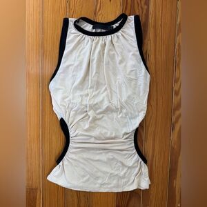 Lightly worn. Black trim. Cream in color. Cutouts at waist/hips. Tshirt feel. Size M