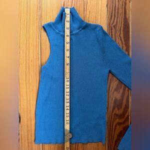 Lightly worn. Blue in color. Ribbed. One sleeve. Flattering fit. Size S