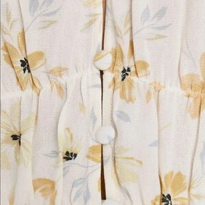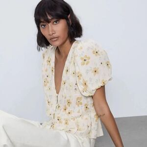 Flowy V-neck shirt. Short puff sleeves. Flounced hem. Front closure with lined buttons.