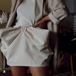 High-waisted mini skirt. Front bow detail. Back hidden in-seam zip closure.