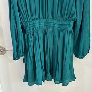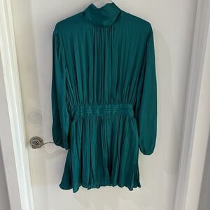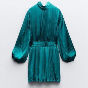 ZARA emerald green turquoise dress satin mock neck pleated ruched NWOT S