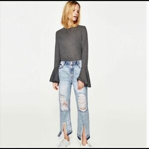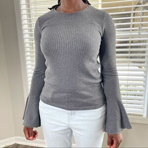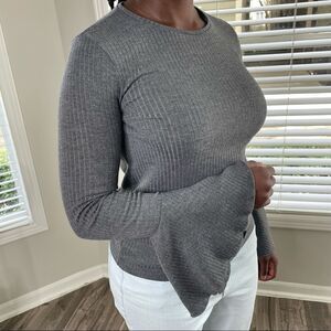 Full length gray top Ribbed knit blouse Pull on closure Long flared sleeves Crew/scoop neck