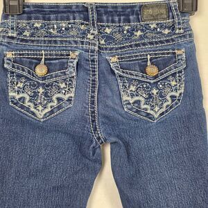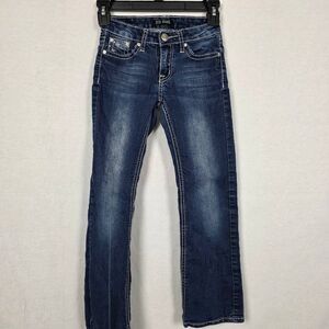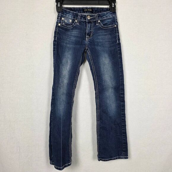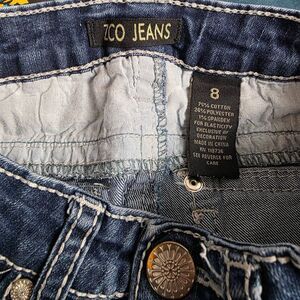 ZCO Girls bootcut jeans, size 8. Medium wash stretch denim (75% cotton, 24% polyester, 1% spandex). Embroidered back pockets with silver-tone buttons. Light whiskering and gentle fading. Pre-owned but still in good shape with no holes or stains. Cute Western/bling style and great everyday wear.