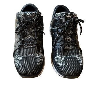 size 13, black and ash white, laces, collapsible heel, hands-free slip on sneakers.