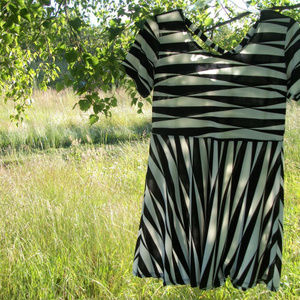 ZEBRA ZEBRA. THIS IS SUCH A CUTE DRESS. THE BLACK AND WHITE STRIPES ARE EVEN MORE BOLD IN PERSON. THEY ARE BRIGHTER AND STAND OUT MORE. THE CUTOUT PART IN BACK IS MORE A OF CRISS CROSS. THE DRESS IS 82 % POLYESTER, 12 % COTTON AND 6 % SPANDEX. THE BRAND BELLA BERRY USA. BUT MADE IN CHINA. FROM UNDERARM TO UNDERARM ALL THE WAY AROUND IS 42 INCHES. ALL THE WAY AROUND THE WAIST IS 38 INCHES. WITH TONS OF WEAR AND A LITTLE PILLING BUT PLENTY TO SHARE WITH YOU BUYER. ZEBRA ZEBRA.