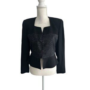Elegant vintage black lace-paneled jacket blazer with long sleeves, perfect for adding a touch of sophistication to any outfit. Size 6 for a tailored fit. Ideal for formal or casual events.