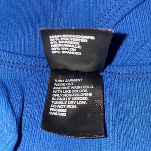 Washable Royal blue polyester spandex blend tank top for a fitted, stretch feel with nylon spandex blend black mesh racerback straps, curved hem. Excellent condition. Size Large (10/12), measures 14.5” from armpit to armpit and 20” from top of shoulder to bottom hem.