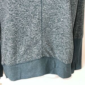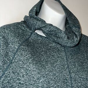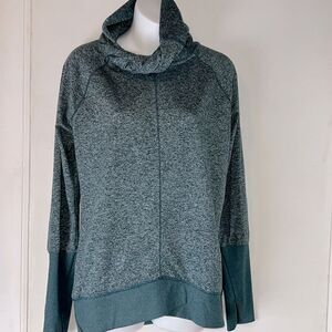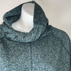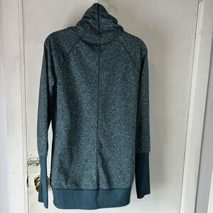 Washable polyester spandex blend in a turquoise Heather color with long cuffs with thumbholes, twisted cowl neckline and split hem for comfort and movement. Excellent condition. Size Small, measures 20” from armpit to armpit and 27” from top of shoulder to bottom hem.