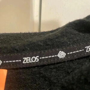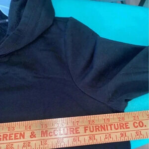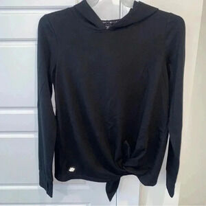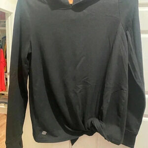 Women's Black Pullover Hoodie with Long Banded Sleeves and Bands with Thumb Hole by Zelos Brand, Size Medium. Long Sleeves. Decorative Knot on Lower Front.