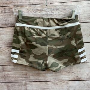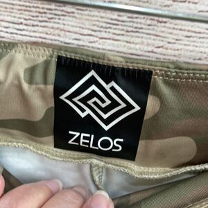 EXCELLENT CONDITION ZELOS SHORTS IN CAMO SIZE SMALL WAIST 25 INCHES INSEAM 2 INCHES 89% POLYESTER 11% SPANDEX
