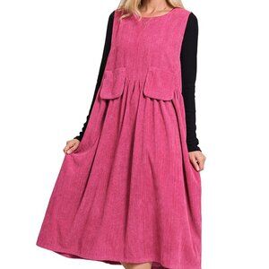 ZENANA Premium Magenta XL Corduroy Overall Popover Jumper Midi Pockets Dress