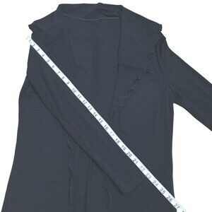 Effortlessly refined and quietly luxurious, this ZENOBIA two-piece set captures the essence of Stealth Wealth and Modern Minimalism. Crafted in Canada from a soft, stretchy jersey knit, the ensemble pairs a sculpted ruffle-trim cardigan with fluid, wide-leg pants — an Elevated Everyday silhouette that transitions seamlessly from lounge to travel to casual workwear.