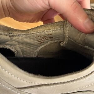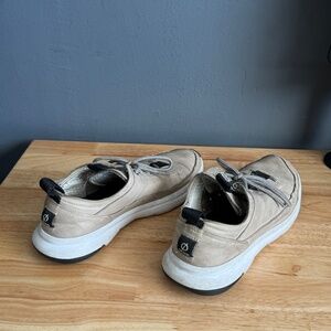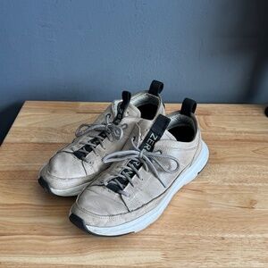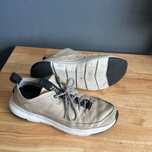 Cole Haan sneakers - very stylish cream, white and black. Can be dressed up or down, though these look best paired with pants. Durable and long lasting. See images of the sole for wear pattern.