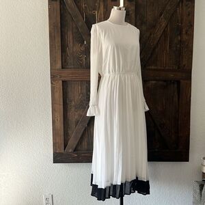 Our pleated dress features long sleeves, crew neck, ruffled elastic cuffs, chic pleated design adds elegance to this women's midi dress; detachable belt, invisible back zipper, flowy A line style, contrast color hem gives the overall look both style and a touch of playfulness.