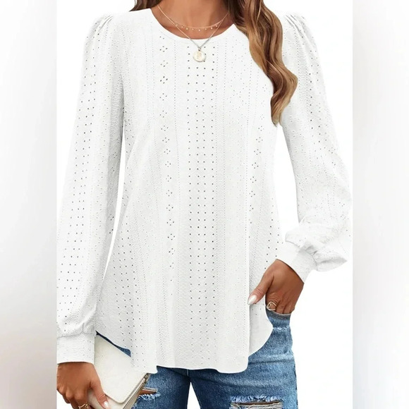 This womens tops features puff long sleeve, crew neck, solid color, loose fit, business casual style, eyelet design.
