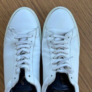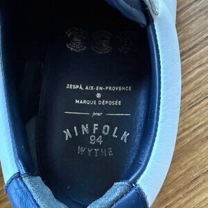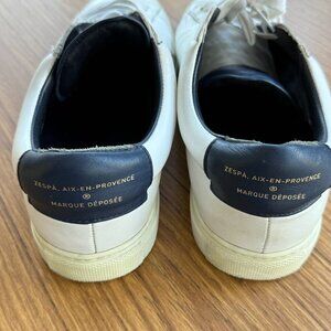Premium collaboration between ZESPÀ and KINFOLK. White leather sneakers with navy and gold accents. Men’s EU 44.5 / US 11. Luxe, clean silhouette with minimal wear.