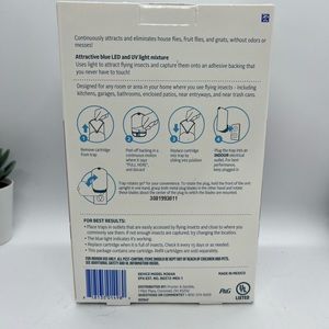 Designed for any room in your home where you see flying insects. 24/7 continuous attraction to capture house flies, fruit flies and gnats without odors or messes. Attractive blue LED and UV light mixture. Device measures approx. 6.5” tall.