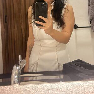 White minidress with square neck and rhinestone detail and rhinestone fringe. So cute - bought and wore once for my bachelorette party! Goes great with a white cowboy hat :) No damage to the stones.