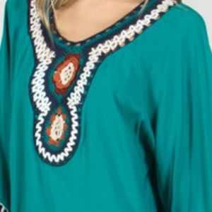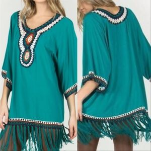 I love this ZIGGY Teal Tunic Top in an eye catching color!! This Light-weight tunic with round neck, crochet trim, 3/4 sleeves, and bottom fringe is a must have