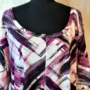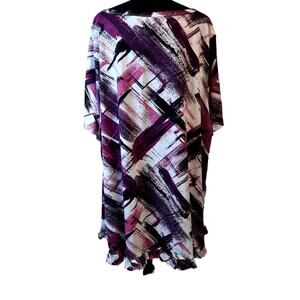 Elevate your wardrobe with this stunning Zim & Zoe Medalin women's tunic in a beautiful Purple and Black Painted Abstract pattern. This plus-size 30/32 features a scoop neckline, short sleeves, and a ruffle hem that adds a touch of elegance to your outfit. The tunic is made of a comfortable cotton material that feels soft against your skin. Perfect for any occasion. NWT. Shoulders 40", Pit 58", Length 34".