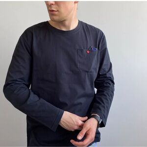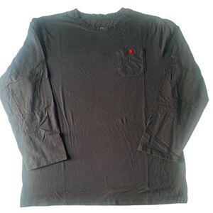 *Style profile: Classic black long sleeve tee with pocket with red button, stylish, versatile.