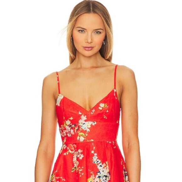 Self: 100% linen.Lining: 100% cotton. Made in China. Machine wash. Unlined. Hidden back zipper closure. Smocked back panel. Adjustable shoulder straps.Midweight linen fabric. Revolve Style No. ZIMM-WD433. Manufacturer Style No. 8308DRS241.