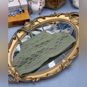 The Waverly Knit Crochet Bandeau Bikini in Mismatched Green & Cream Floral from the Zimmermann Resort Swim 2024 Collection. A green cotton crochet halter bandeau bikini top is paired with a cream floral lycra swim pant.