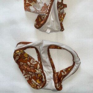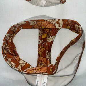 Apricot orange/multicolour floral-print ruffled bikini set from ZIMMERMANN KIDS featuring all-over floral print, ruffled detailing, square neck, self-tie fastening, mid-rise and slip-on style.
