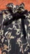 Zimmermann maxi dress in a black semi-sheer silk with an allover abstract flower print in grey satin. Features a tiered ruffle hem, balloon sleeves, and a ruffle collar with a black velvet bow tie.