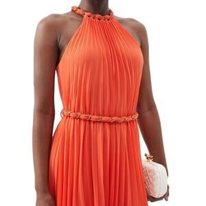 ZIMMERMANN TANGERINE CHIFFON MAXI PLEATED SLEEVELESS BELTED DRESS W CHAIN SZ 6 in pristine preloved condition. No signs of wear. No flaws. Current similar styles are sell for MSRP US 1350.00 and up. Length from neck to hem 49” Waist 28” Bust 34”