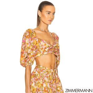 ZIMMERMANN Violet Twist Front Puff Sleeve Crop Top in Khaki Multi Floral