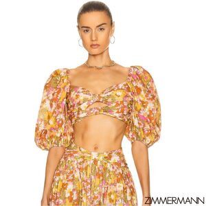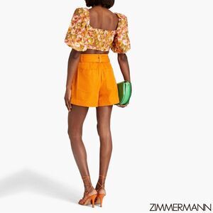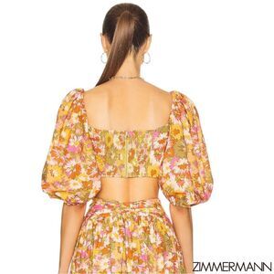 Violet Twist crop top from ZIMMERMANN featuring orange, multicolour, cotton, all-over floral print, sweetheart neck, shirred panel, short puff sleeves, cut-out detailing, cropped and concealed rear zip fastening.