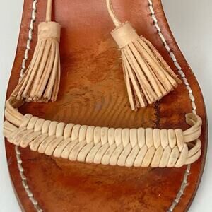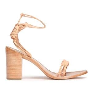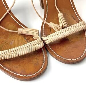 Slim, leather straps weave together on these effortless Zimmermann sandals. Tassels trim the wraparound ankle ties. Stacked heel with rubber cap.