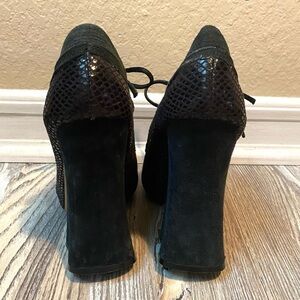 ZINC Black Suede and Leather Snakeskin Peep-toe Heels with chunky heels, suede string tie front