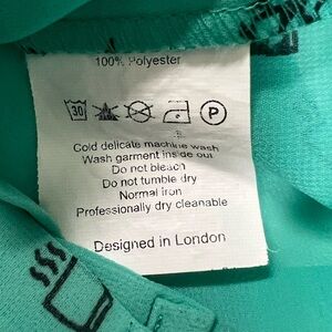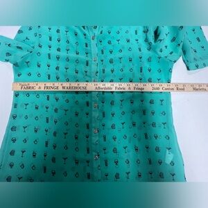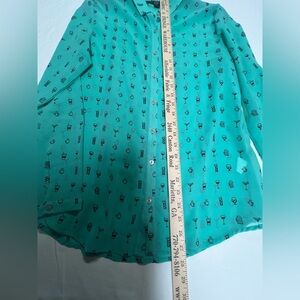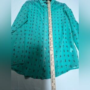 This relaxed shirt from ZINK features a vibrant turquoise hue and a classic dress shirt collar. Its buttoned design offers a comfortable fit, making it a versatile addition to any wardrobe. Fun black graphics on shirt.