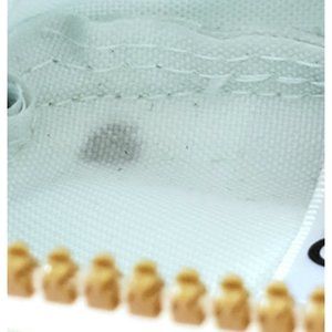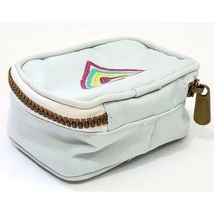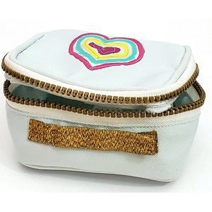Pale blue with heart design on top. Plastic zipper closure with gold fabric handle.