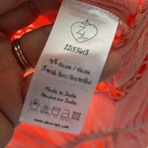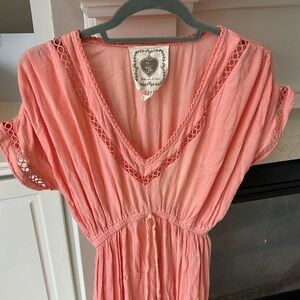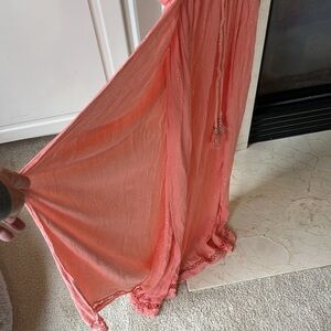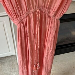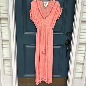 Z&L Peach Gold Boho Gauze Maxi Dress. Short sleeves, v neck. Great detail at sleeves, neckline and bottom hem. Elastic waist. Tie at waist with tassels. Open bottom with a front and back fabric panel. Gorgeous silver metallic thread detail. Size ?