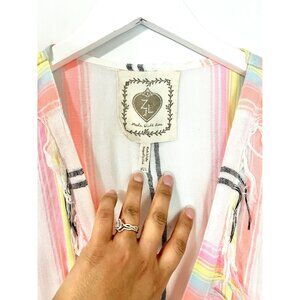 Z&L White/Pink Striped Multicolored Boho Pom Pom Frayed Hem Tunic/Midi Dress Side Slit Size M/L