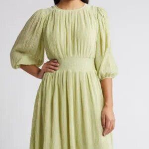 The ZOE AND CLAIRE three-quarter sleeve midi dress in dusty mint green captures that elusive blend of casual grace and poised elegance. In this soft, muted hue, the dress feels like a gentle brush of a spring breeze—delicate but striking. Its nipped-in waist with smocked detailing and slightly puffed sleeves add a touch of romantic whimsy, while the flowy skirt ensures a graceful silhouette that moves with you. The classic crewneck offers an understated simplicity, it's fully lined, and is beautifully paired with the practical back zip closure. This dress adapts effortlessly to your day. Perfect for seamless transitions from day to evening. Swing into a breezy weekend getaway or a picturesque brunch date, effortlessly pairing with your favorite sneakers for a casual downtown vibe or delicate sandals for something more refined. This midi dress is a versatile staple in any wardrobe! Excellent pre-loved condition - no flaws!