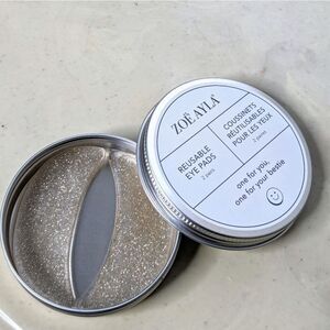 Use these reusable eye pads with your own eye cream to help lock in and sustain the benefits. Rinse off and store in the round metal canister for another day. New and unused.