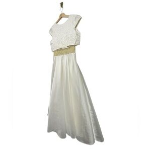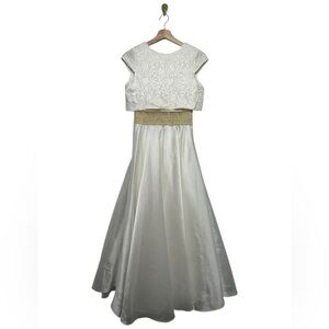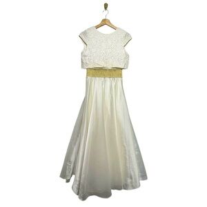 This elegant kids dress features a beautiful white bodice with a shimmering gold waistband, perfect for special occasions.