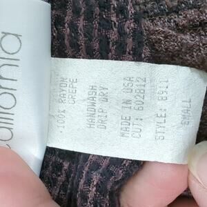 Vintage brand Zoe California 100% ran crepe made in USA size small women's lagenlook art to wear Patchwork ground peplum hem buttoned down sweater chiffon detail cute pocket length 29. flat across underarm 21 in. Excellent vintage condition!