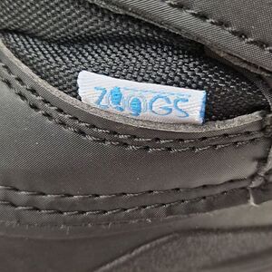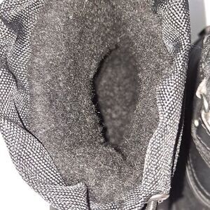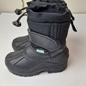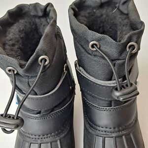 Black, size 5. Zoogs brand, black with gray lining. Toggle pull top to cinch pants in and keep snow out. Velcro front strap to tighten. Keep his feet warm and dry this winter!