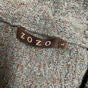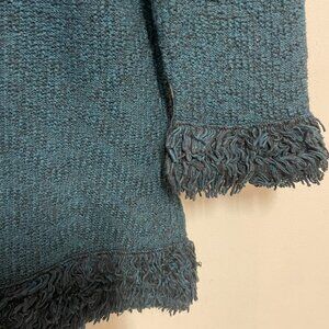ZOZO fringe sweater, 3/4 fringed sleeve, teal & brown, 62% cotton, lyocel, rayon, nylon, & silk. This is a super fun sweater that crosses seasons.