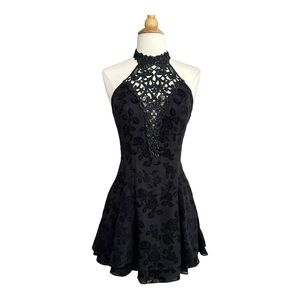This chic black mini dress features a sleeveless halter neckline, sheer velvet burnout layer over a solid black liner and an open back. The fit and flare style accentuates the waist, while the flared skirt adds a playful touch.