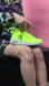 THE SHOES ARE CAUTION YELLOW, BLACK LOGO AND WHITE OUTSOLE.