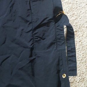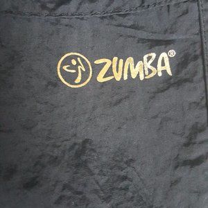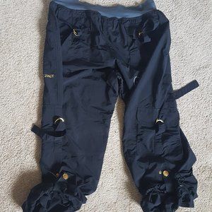 Popular and in-demand ZUMBA Women's black 100% nylon cargo drawstring pants with adjustable ankles, side pockets, and back pockets. Has gold accents and grey Zumba writing on the right back leg. Pants can retract with clip buttons / snaps for convenience. X-Large. Virtually new.