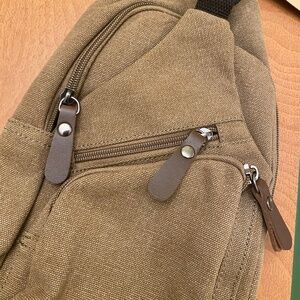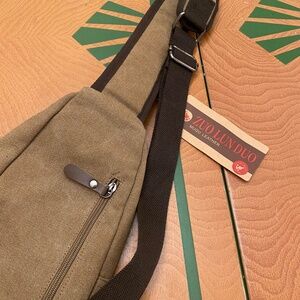 Brand new with tags! ZUO LUN DUO MUGU brand canvas and leather shoulder bag. Really utilitarian with great pockets and USB charging port and cord included. Unisex - can be worn by many sizes - nice length of shoulder strap and comfy construction.